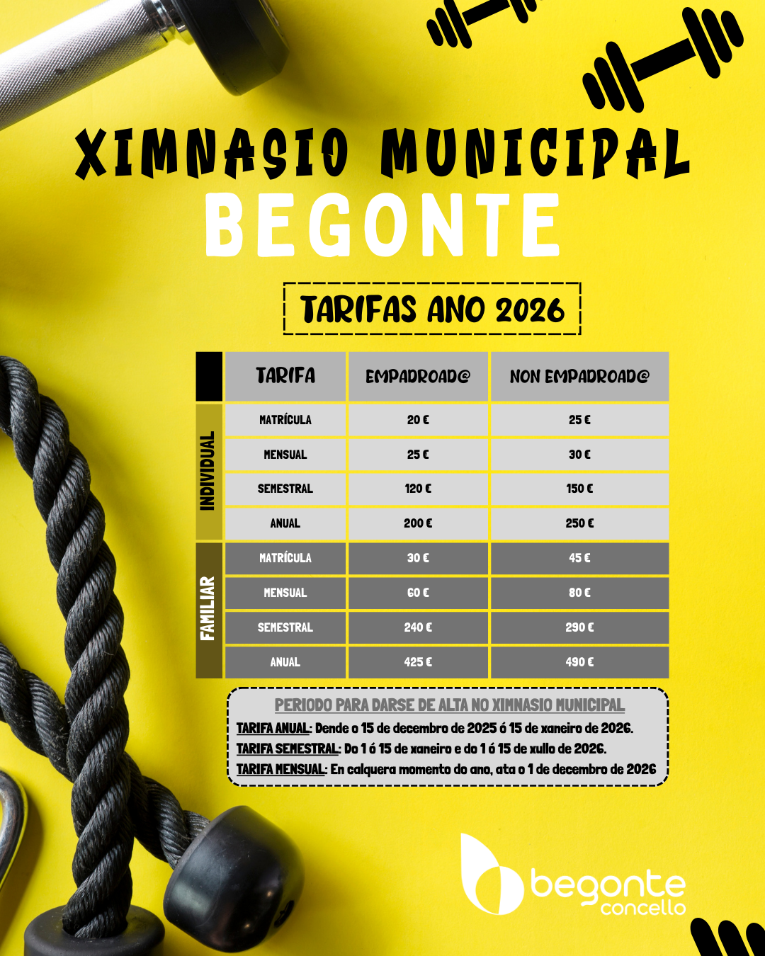Avisamos a tódolos usuarios e usuarias do Ximnasio Municipal de Begonte das novas tarifas para o ano 2026.