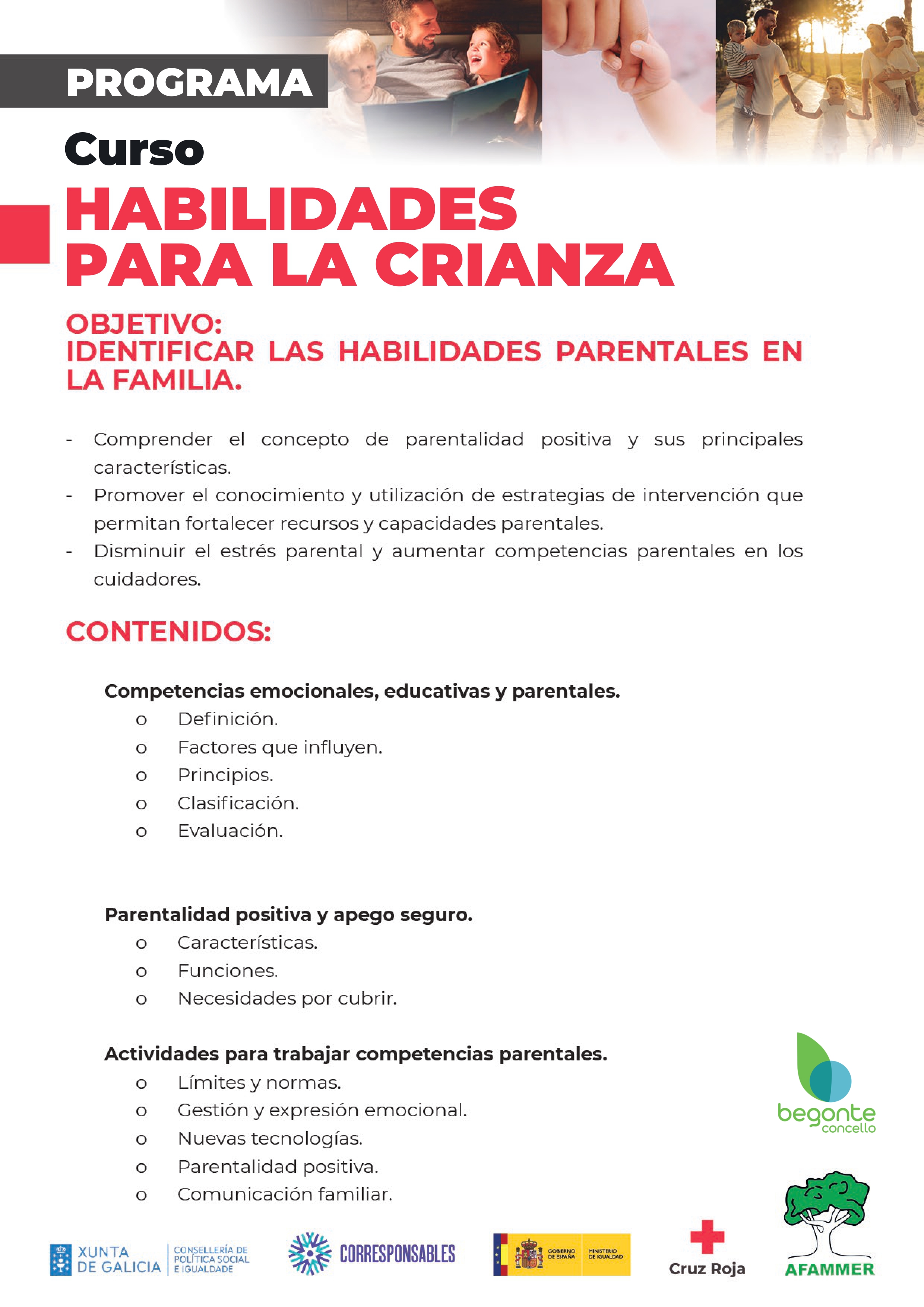 El 𝐀𝐲𝐮𝐧𝐭𝐚𝐦𝐢𝐞𝐧𝐭𝐨 𝐝𝐞 𝐁𝐞𝐠𝐨𝐧𝐭𝐞, a través de 𝐀𝐅𝐀𝐌𝐌𝐄𝐑 (Asociación de Familias e Mulleres do Medio Rural) convoca un curso gratuíto 📚 sobre HABILIDADES PARA LA CRIANZA, dirigido a 𝐦𝐚𝐲𝐨𝐫𝐞𝐬 de 𝟏𝟖 años, que se llevará a cabo el próximo 21 de octubre en horario de ⏰ 𝟏𝟔.𝟎𝟎 𝐚 𝟐𝟏.𝟎𝟎𝐡 en la 📍 𝐂𝐚𝐬𝐚 𝐝𝐞 𝐥𝐚 𝐂𝐮𝐥𝐭𝐮𝐫𝐚.