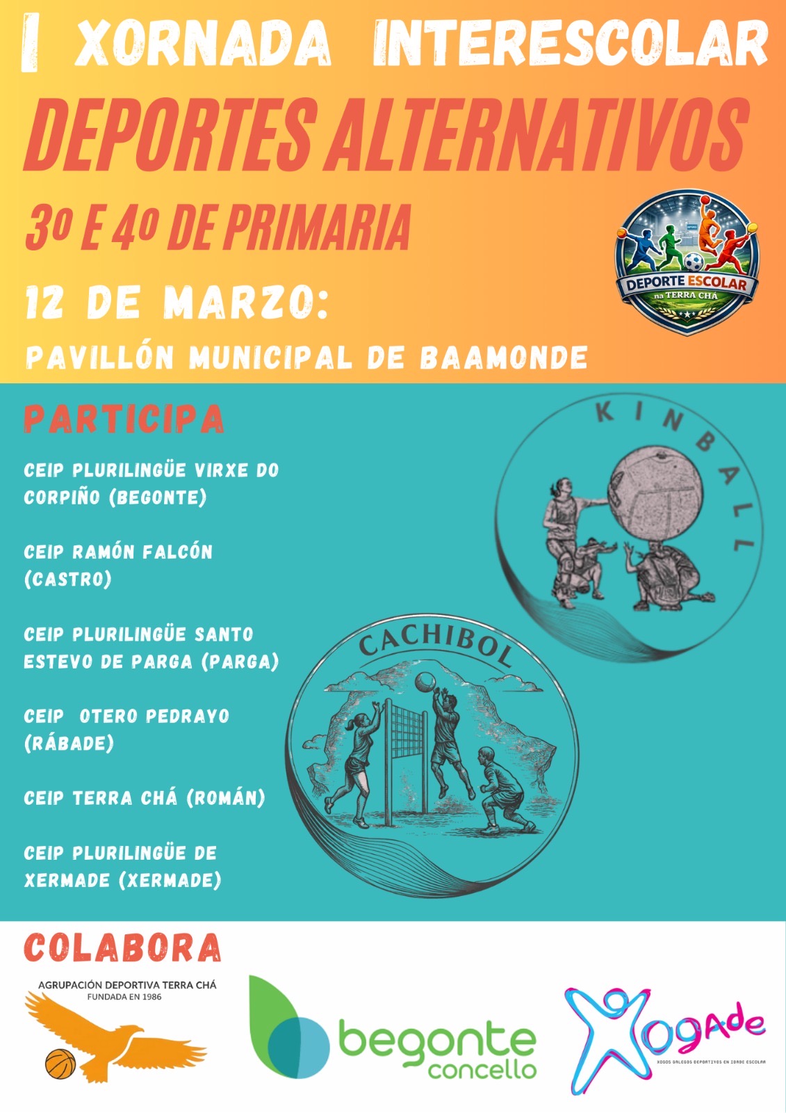 O vindeiro ποΈ xoves día 12 de marzo, o ποΈ Pavillón Municipal de Baamonde acollerá a I Xornada de Deportes Alternativos entre os escolares de 3º e 4º de primaria do π’ CEIP Plurilingüe Virxe do Corpiño (Begonte), π’ CEIP Ramón Falcón (Castro de Rei), π’ CEIP Santo Estevo de Parga (Guitiriz), π’ CEIP Otero Pedrayo (Rábade), π’ CEIP Terra Chá de Román (Vilalba) e π’ CEIP Plurilingüe de Xermade.